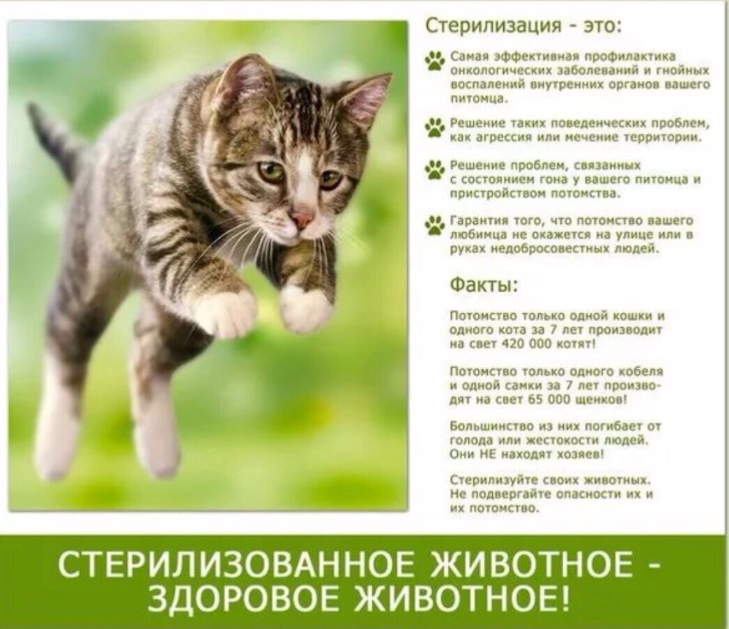 - Стерилизуя Ваших кошек и собак, вы контролируете численность бездомных животных. Данная операция проводится один раз в жизни животного, избавляя Вас от необходимости «пристраивания» котят и щенят в добрые руки.